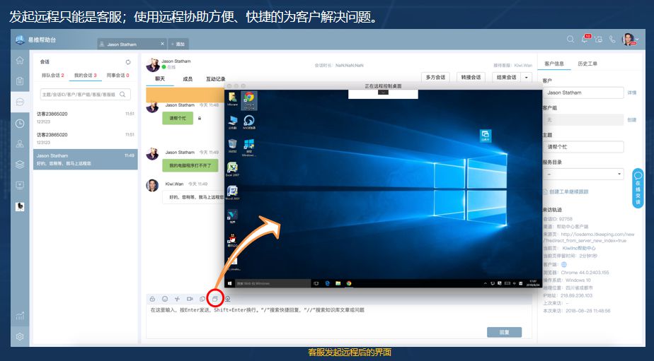 发起远程只能是客服;使用远程协助方便、快捷的为客户解决问题。