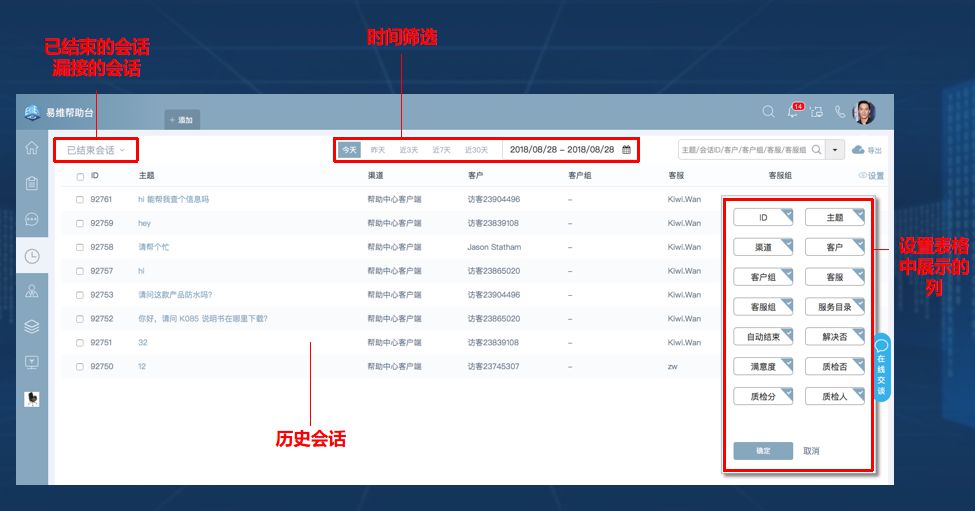 管理人员可以对历史会话进行浏览、质检评分