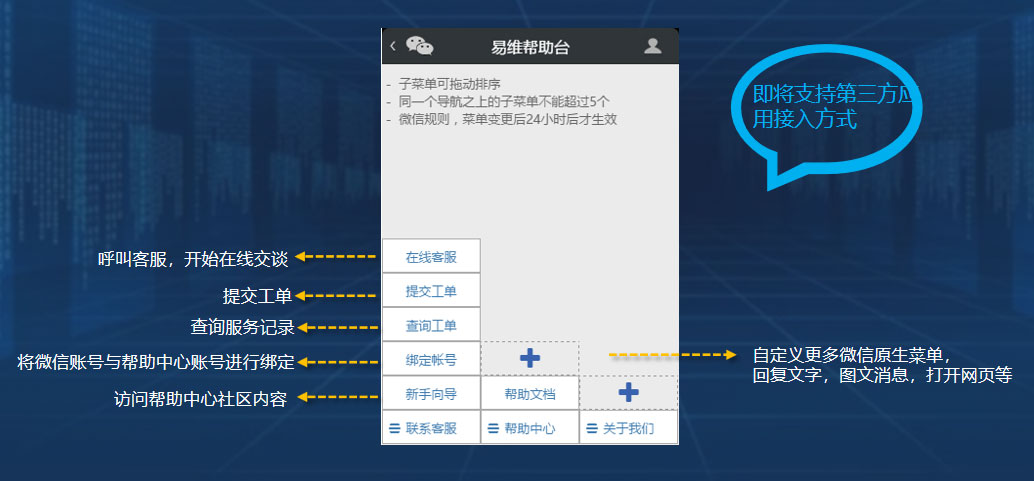 易维帮助台,为用户提供专业的微信在线客服系统,利用微信开放平台接口,接入微信服务号和企业号(已取得微信认证),帮助客户智能高效地链接用户,实现IT基础架构的全方位监控,优化IT服务流程,更好的提升综合运维服务的管理水平。
